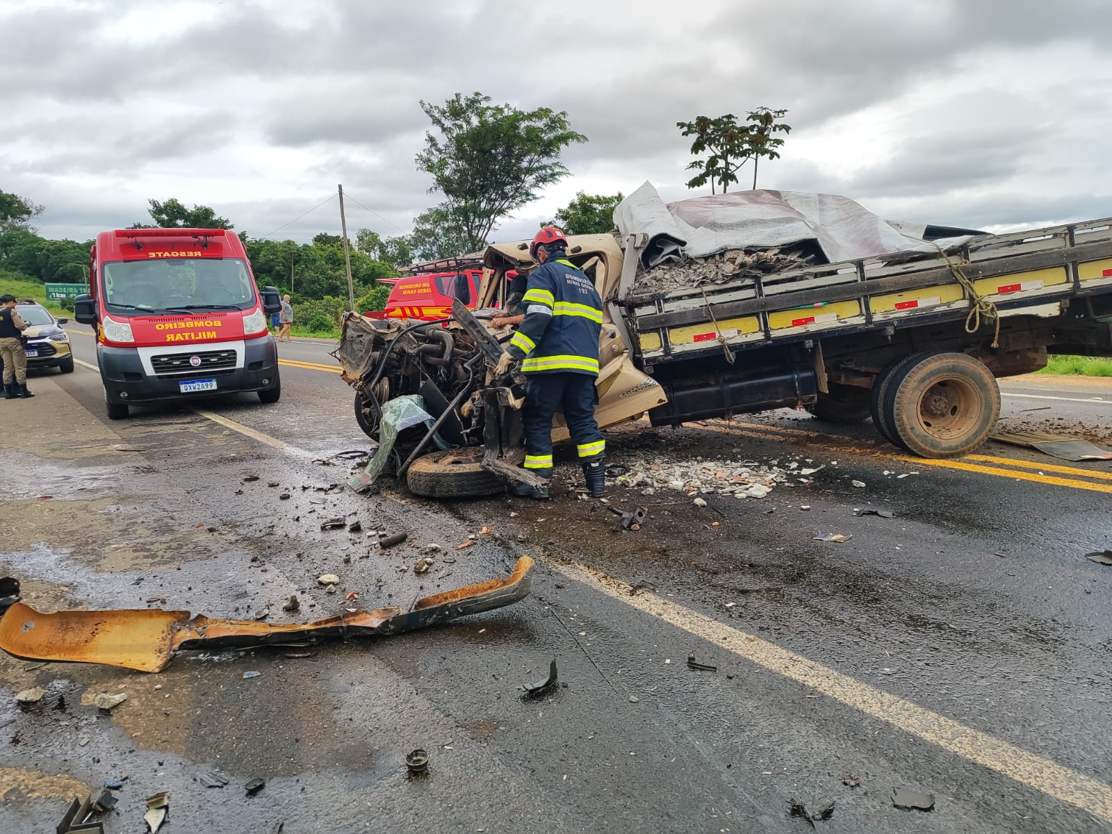 Com o impacto, duas pessoas que estavam na caminhonete ficaram feridas. Um homem de 75 anos, passageiro do veículo, sofreu escoriações leves e recebeu atendimento no local. O motorista ficou preso às ferragens, sendo necessária a intervenção dos bombeiros, que utilizaram técnicas de salvamento veicular para realizar a retirada com segurança.