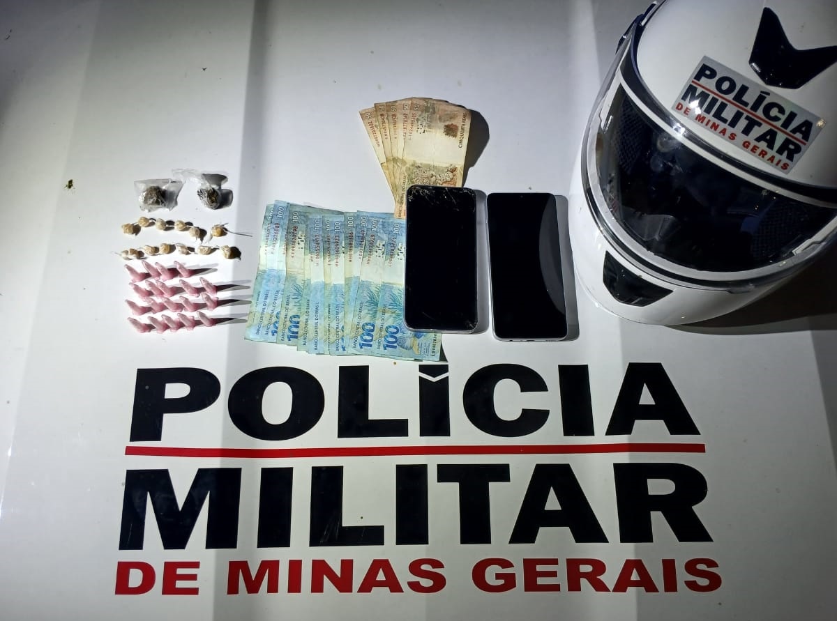 Com o menor, os agentes encontraram R$ 1.600 em dinheiro. No pacote arremessado, foram apreendidos 19 pinos de uma substância semelhante à cocaína, 13 pedras de crack, duas buchas de maconha e dois celulares.
