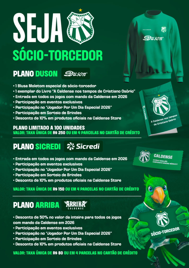Os planos de sócio-torcedor da Caldense preparador pelo departamento de marketing para a temporada 2026 estão repletos de vantagens e novidades! O principal é o “Plano Duson”, que oferece uma blusa especial de moletom, um exemplar do novo livro da Veterana que será lançado até o final do ano, ingressos para os jogos com mando de campo da Veterana e uma série de outros benefícios. O “Plano Sicredi” proporciona acesso aos jogos em casa e diversas vantagens. Já o “Plano Arriba” contempla desconto na compra de ingressos e outros atrativos!