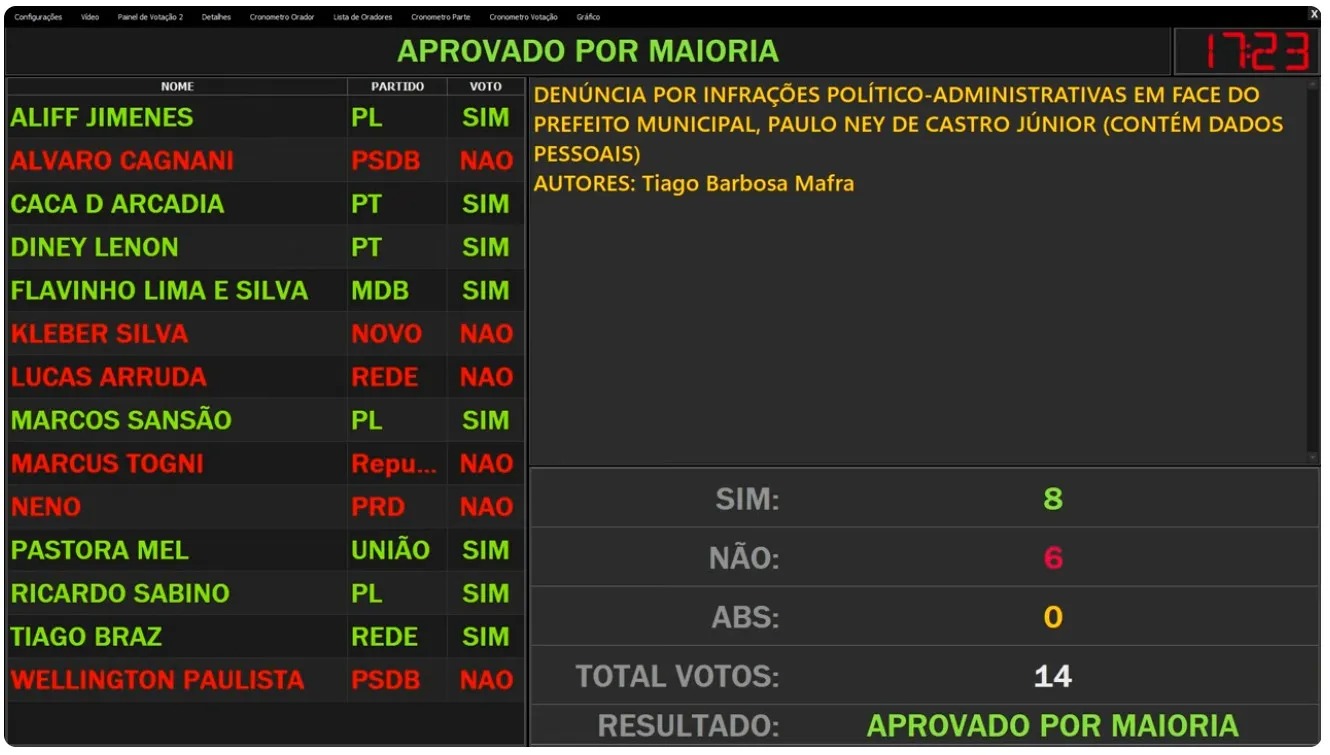 O resultado da votação foi de 8 votos favoráveis e 6 contrários, sem abstenções, totalizando 14 votos. Com a maioria simples, a denúncia foi oficialmente recebida pelo Legislativo e seguirá os trâmites legais para apuração dos fatos.