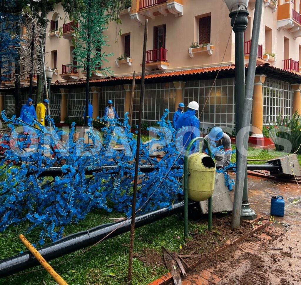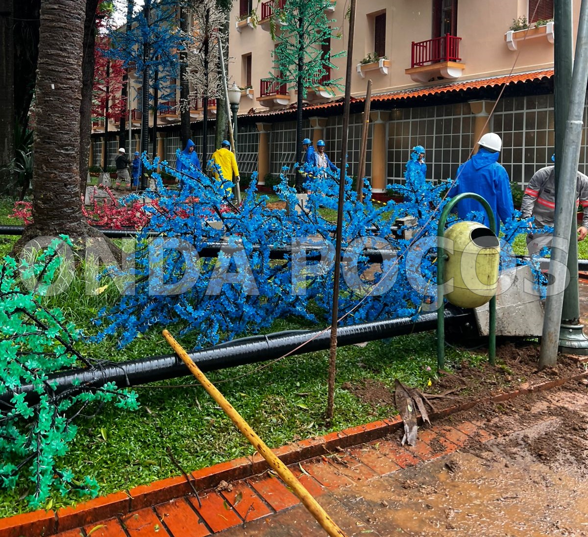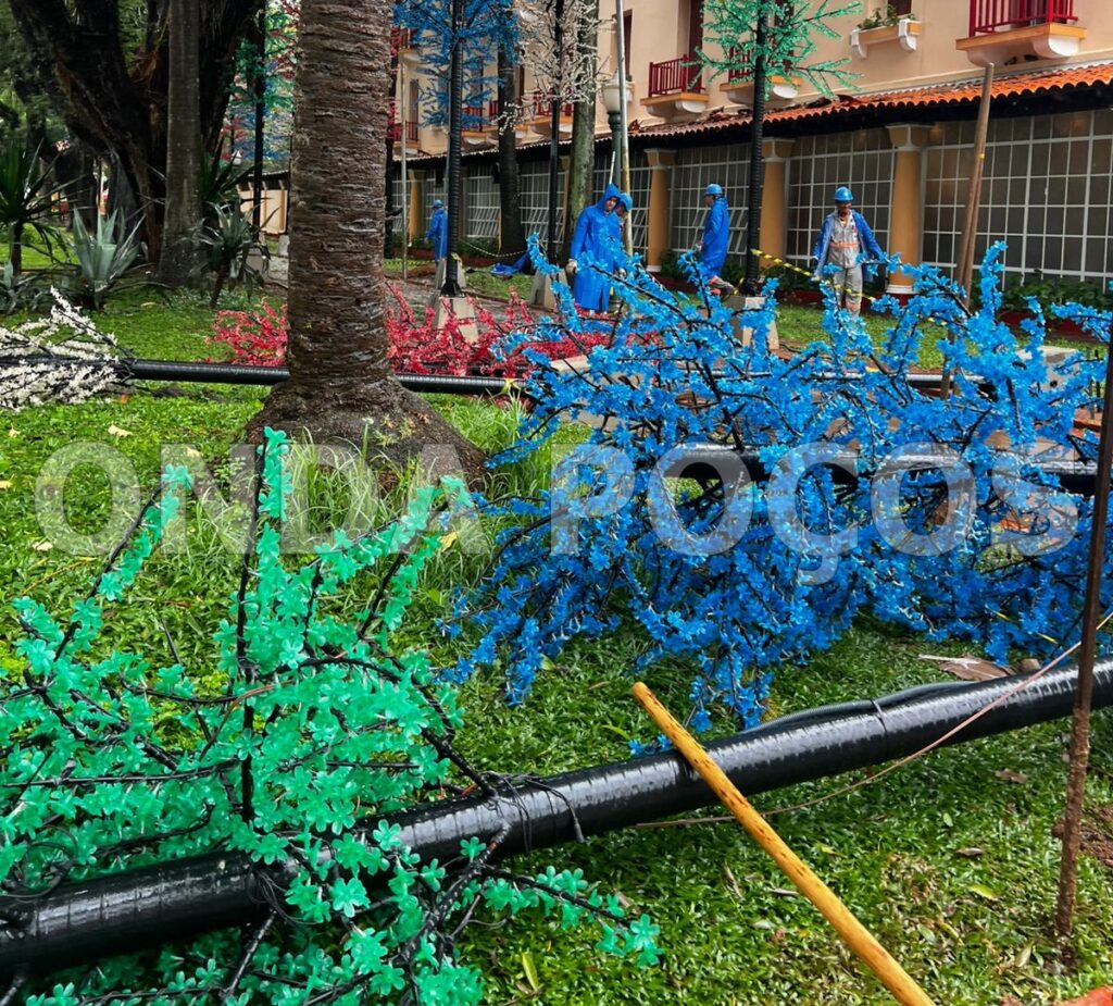 A forte chuva que caiu em Poços de Caldas na madrugada desta quarta-feira (10) e se estendeu pela manhã, acompanhada de um vendaval, derrubou diversas peças da decoração de Natal da cidade.