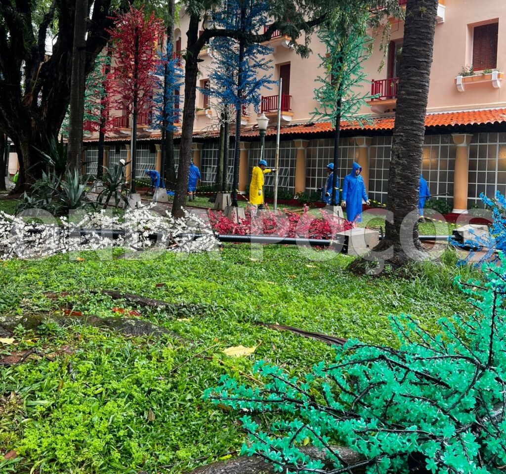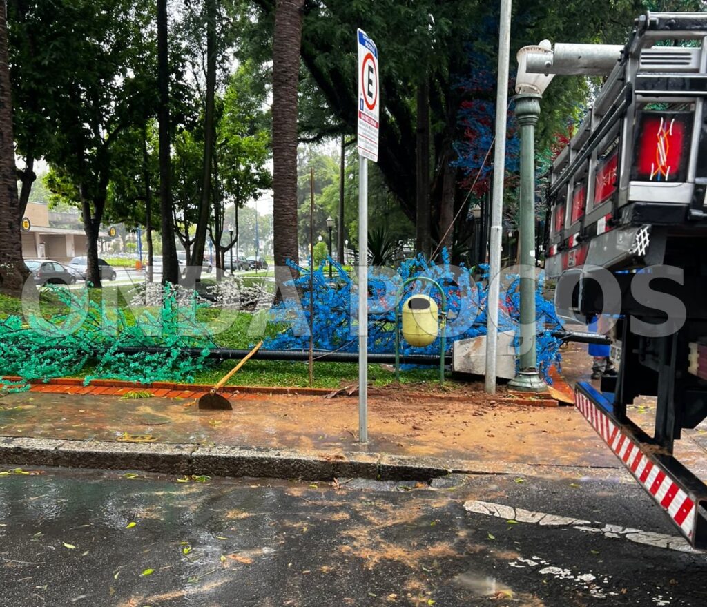 Vários postes iluminados e árvores não resistiram à tempestade e caíram ao chão. A Defesa Civil chegou a ser acionada e isolou os pontos mais críticos onde os enfeites caíram.