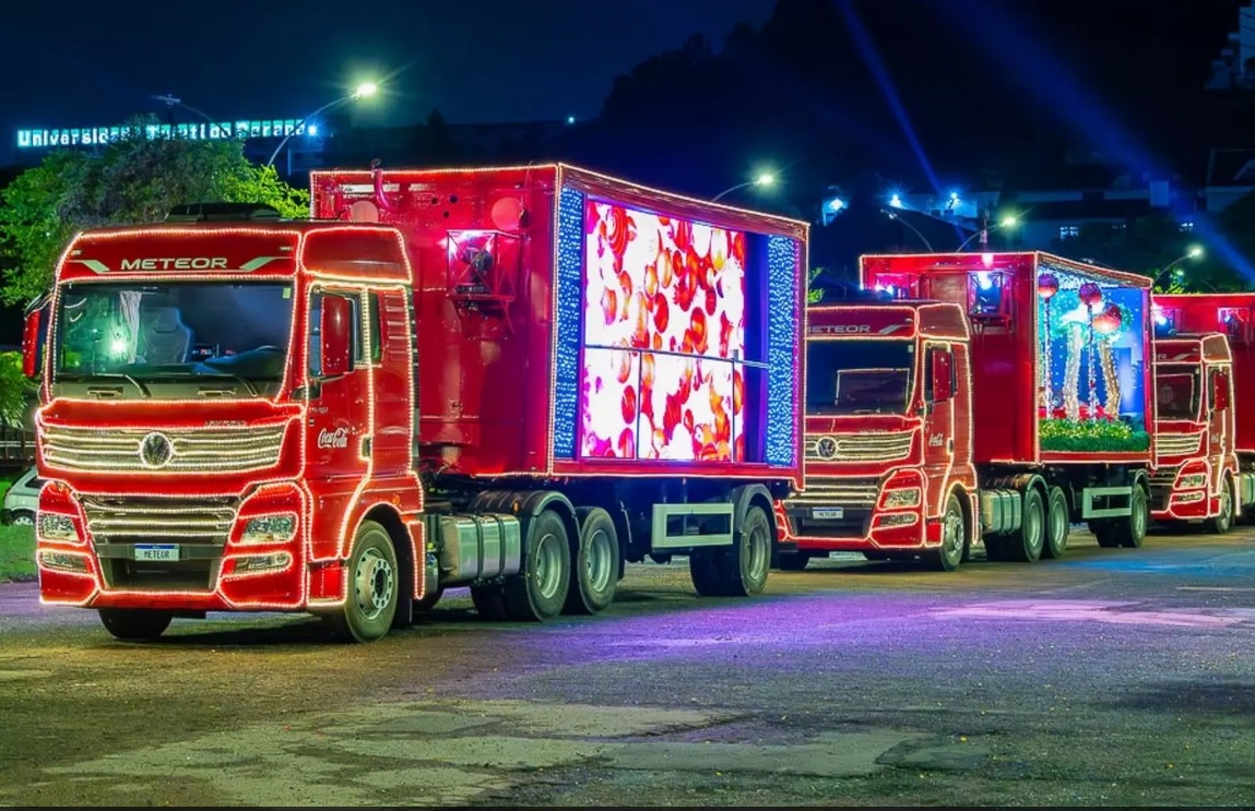 No Brasil, os caminhões iluminados da Coca-Cola devem passar por 20 estados e mais de 200 cidades.