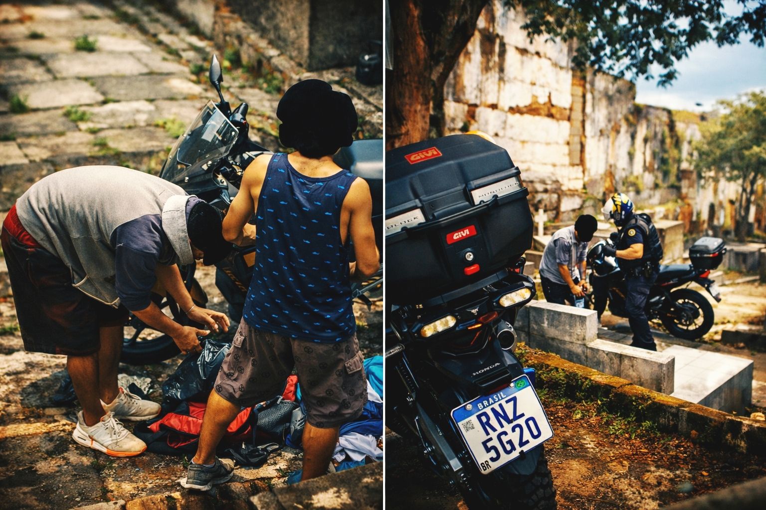 Segundo a GCM, a Central de Comunicação recebeu informação de que dois indivíduos estariam no local manuseando adornos e objetos decorativos de jazigos. Diante da denúncia, a equipe de motopatrulhamento realizou deslocamento imediato com apoio da viatura 701.
