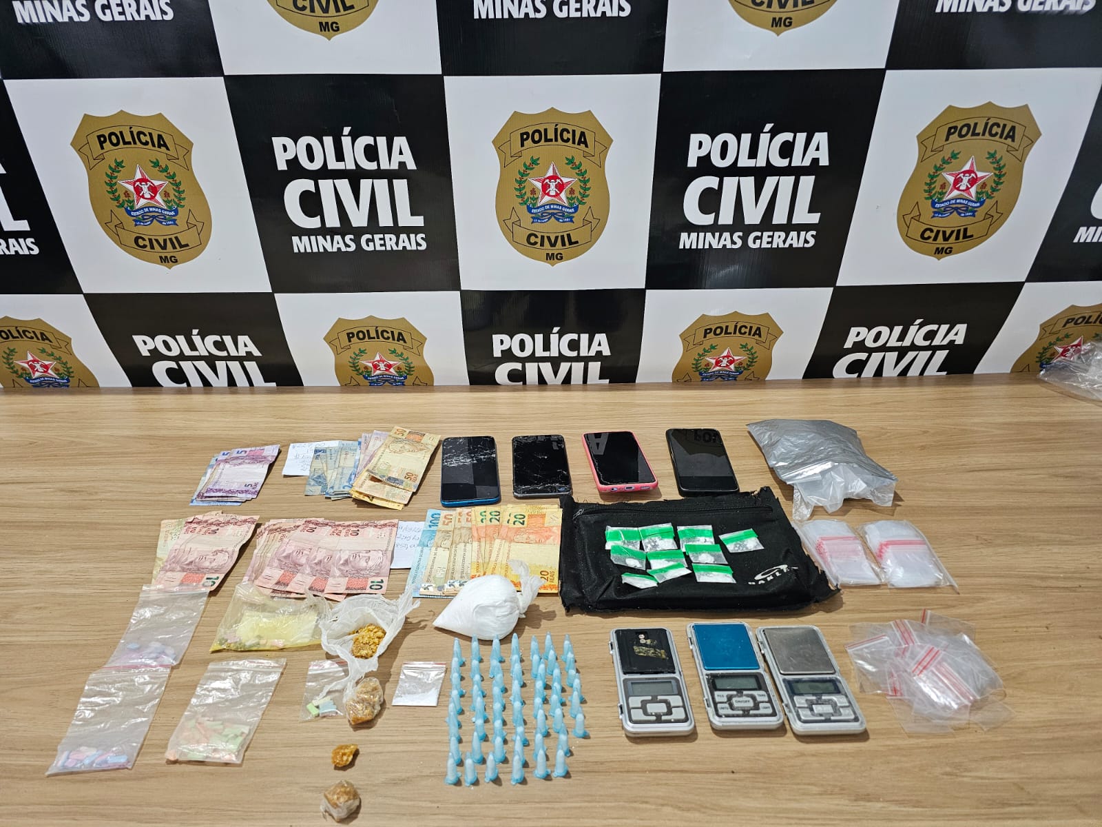 Entre os itens apreendidos estão porções de cocaína, incluindo papelotes e pinos prontos para venda, cerca de 90 gramas da substância em estado puro, comprimidos de ecstasy, pedras de crack, além de três balanças de precisão. Também foram recolhidos R$ 1.527 em dinheiro.