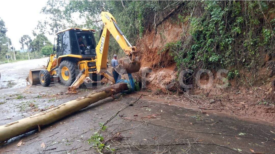 Na tarde deste sábado (8), um eucalipto caiu sobre a rodovia no perímetro urbano de Bandeira do Sul, logo após uma forte chuva que atingiu a região.