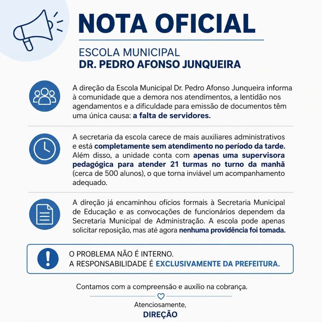 A direção da Escola Municipal Dr. Pedro Afonso Junqueira, em Poços de Caldas, divulgou uma nota oficial informando dificuldades no atendimento à comunidade escolar devido à falta de servidores.