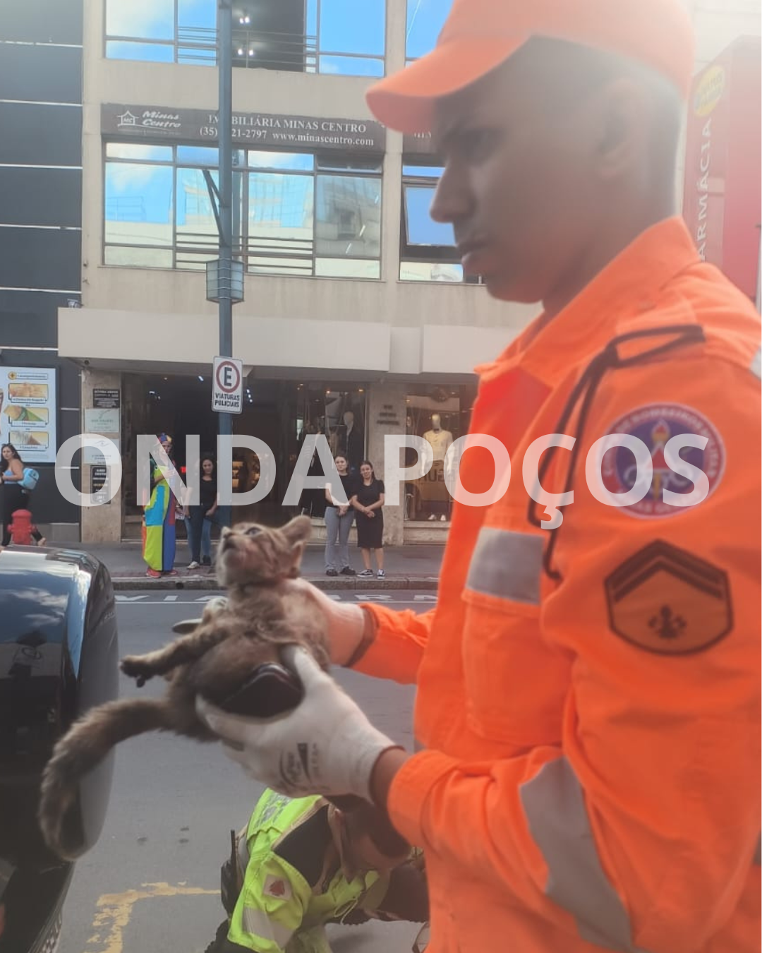 Um filhote de gato foi resgatado pelo Corpo de Bombeiros de dentro do motor de um carro estacionado na Rua Assis, na tarde desta quarta-feira (15), em Poços de Caldas.