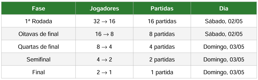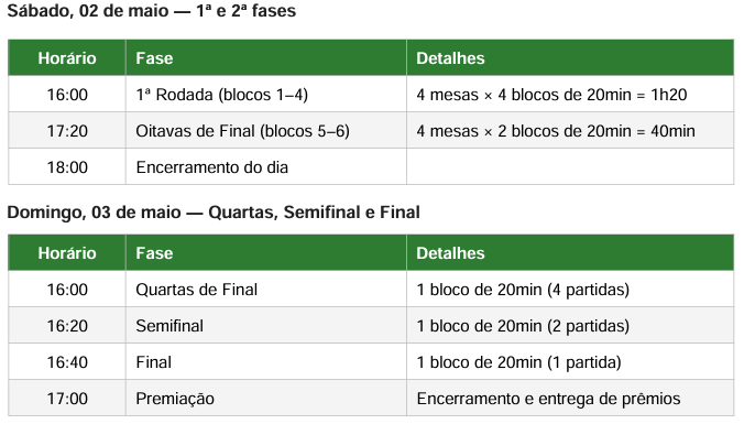 As partidas serão realizadas sem tempo individual cronometrado, em blocos de 20 minutos, permitindo a realização de até três jogos por hora em cada mesa. Em caso de atraso superior a 10 minutos, o participante poderá ser eliminado por W.O.