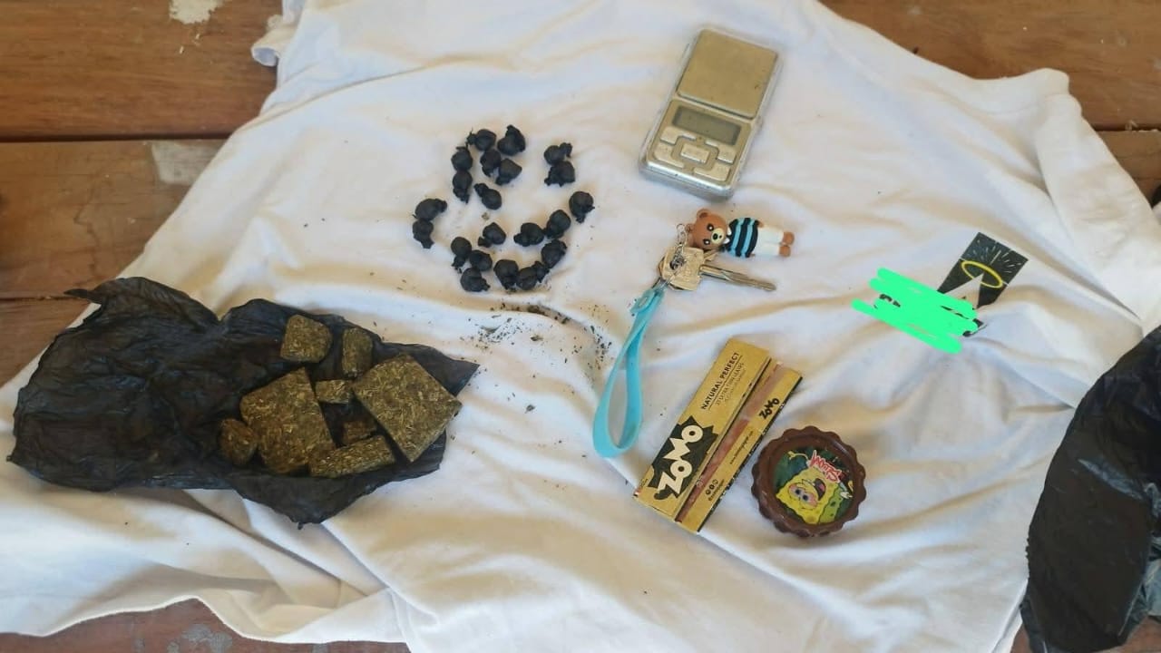 Durante a verificação da área onde os suspeitos estavam, os agentes localizaram uma bolsa preta escondida sob uma árvore. No interior, foram encontrados:
