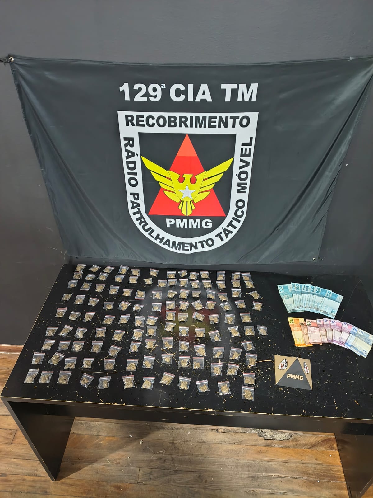 Durante a operação, o cão de faro foi utilizado para localizar os entorpecentes, resultando na apreensão de 123 porções de maconha. Além disso, os policiais recolheram R$ 964 em dinheiro.