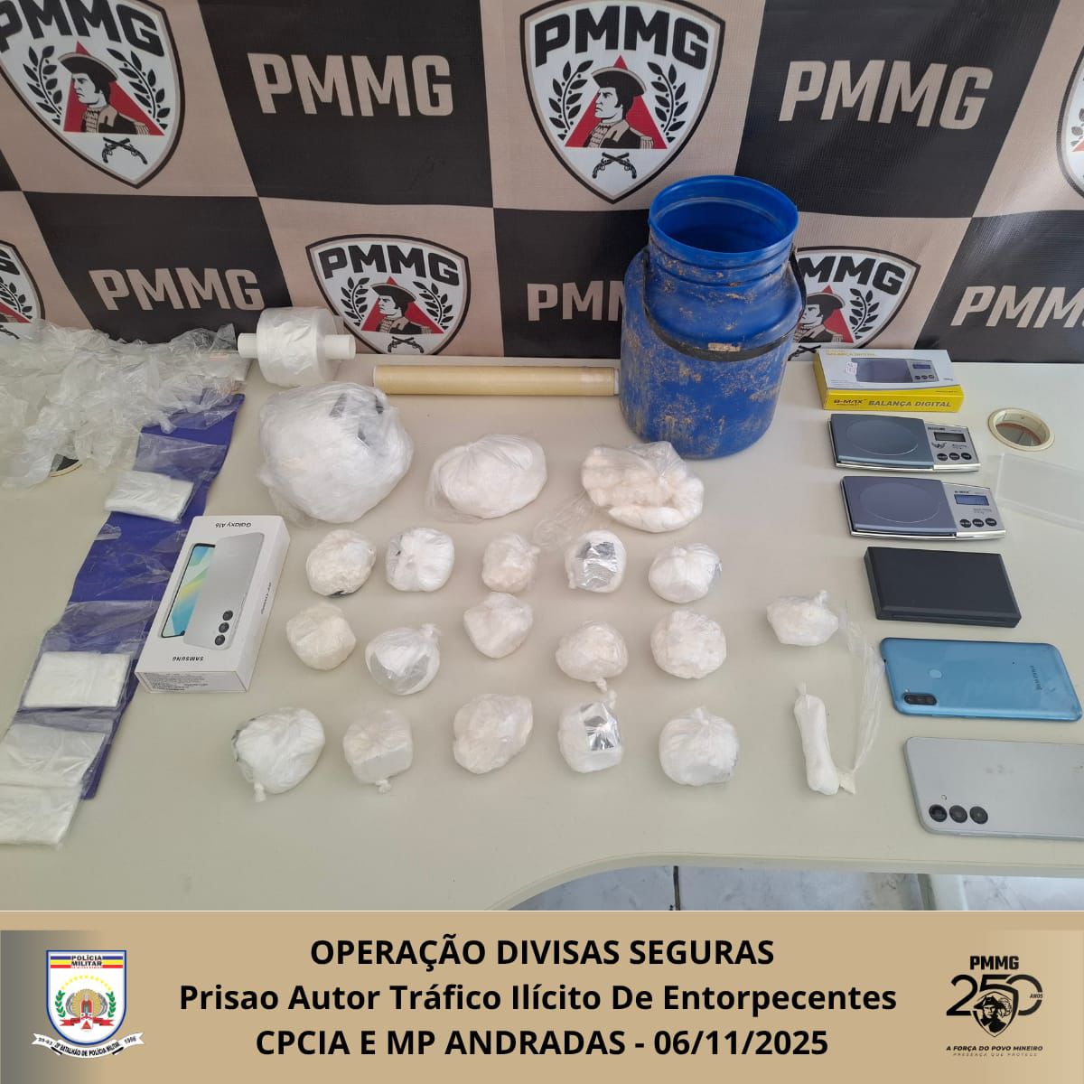 Um homem de 32 anos foi preso em flagrante por tráfico de drogas durante a operação Divisas Seguras, realizada na manhã desta quinta-feira (6) no bairro Rochela, em Andradas.