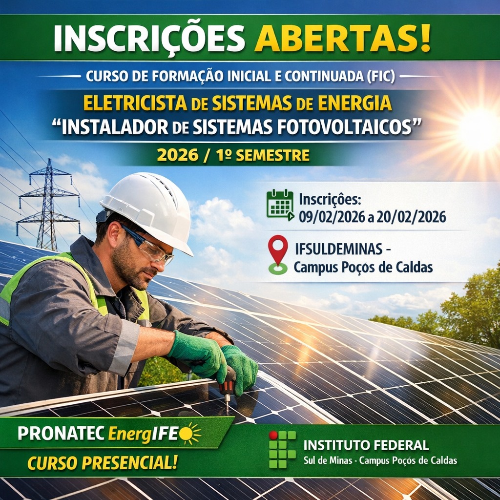 O Instituto Federal do Sul de Minas Gerais (IFSULDEMINAS) – Campus Poços de Caldas está com inscrições abertas para o curso gratuito de Instalador de Sistemas Fotovoltaicos, com início previsto para o dia 3 de março de 2026. A formação é presencial e faz parte da modalidade Formação Inicial e Continuada (FIC).
