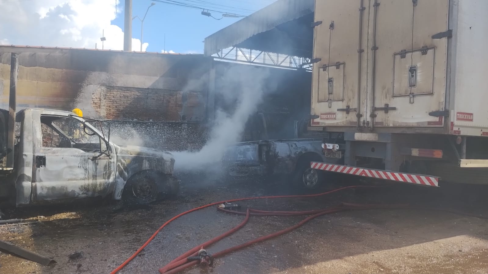 Duas equipes de bombeiros foram empenhadas no atendimento. No local, foi constatado que as chamas atingiram três caminhões de pequeno porte: uma Ford F4000, uma Chevrolet S10 e uma Ford F350. Também foi verificada a presença de fumaça no interior da edificação.