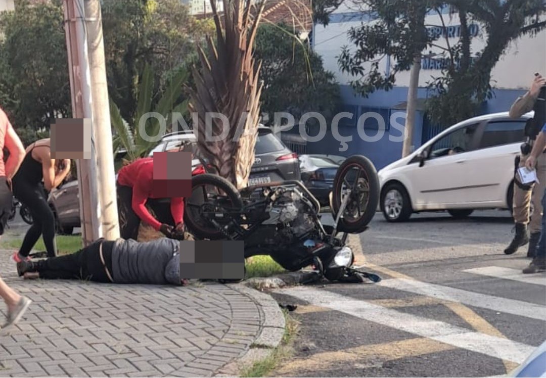 Um motociclista ficou ferido após um acidente no cruzamento das ruas Rio Grande do Sul e Rio Grande do Norte, na manhã desta segunda-feira (1º). De acordo com socorristas do SAMU, o motociclista, de 28 anos, apresentava possíveis fraturas na perna e no braço esquerdos, além de diversas escoriações pelo corpo. Após ser imobilizado, ele foi encaminhado à Santa Casa para avaliação médica.