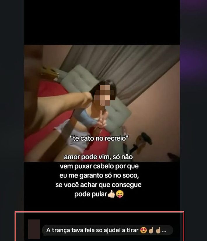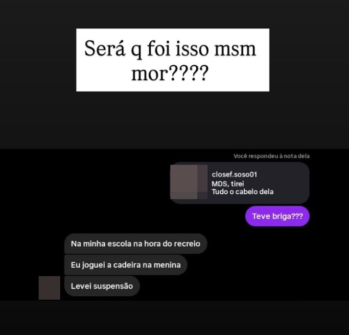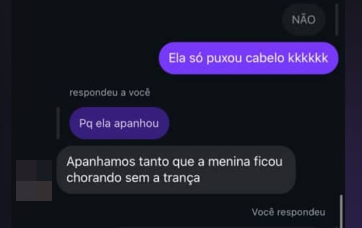 A mãe também encaminhou ao Jornalismo da Onda Poços, prints de redes sociais que mostram algumas alunas se vangloriando por terem tirado parte do cabelo da filha (veja abaixo).