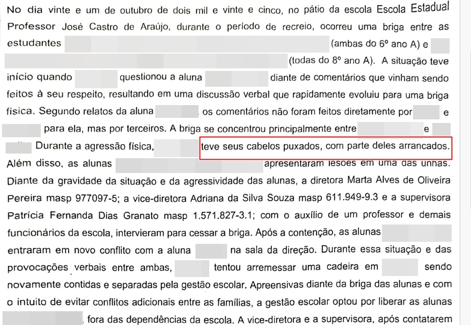 A Polícia Militar foi acionada para registrar o caso, segundo a PM o desentendimento teria se iniciado após divergências entre as estudantes, resultando em agressões físicas e pequenas lesões. A direção da escola conseguiu conter a situação e acionou os responsáveis pelas alunas envolvidas, que compareceram à unidade para acompanhar o caso.
