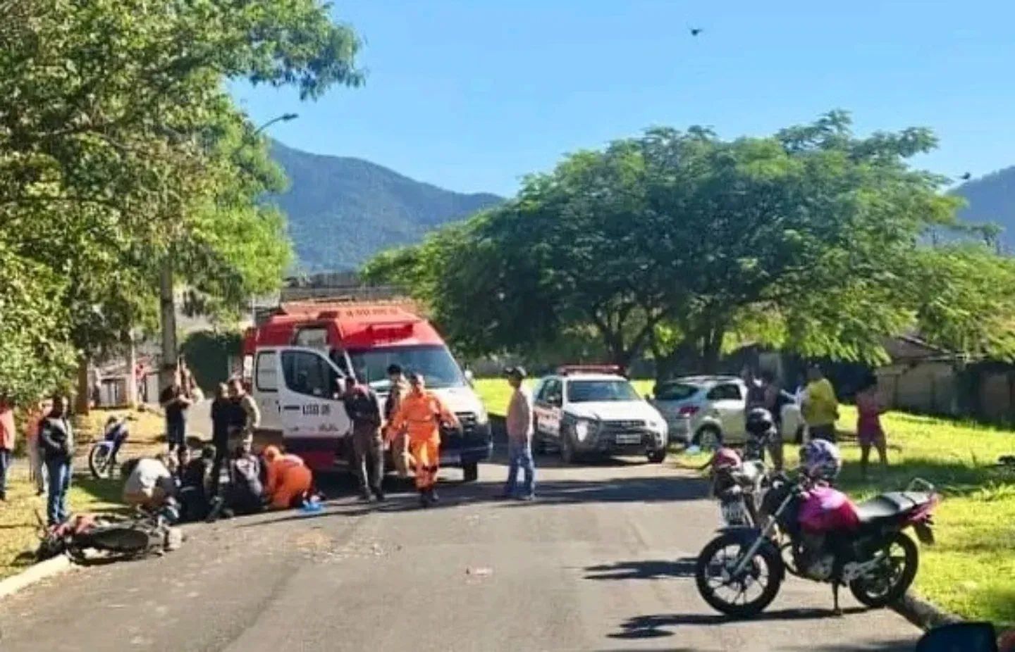 A vítima, que conduzia a motocicleta, estava consciente e orientada, mas apresentava uma fratura grave exposta na perna direita. Os bombeiros prestaram apoio à equipe do SAMU na imobilização do membro ferido e no encaminhamento até a ambulância.