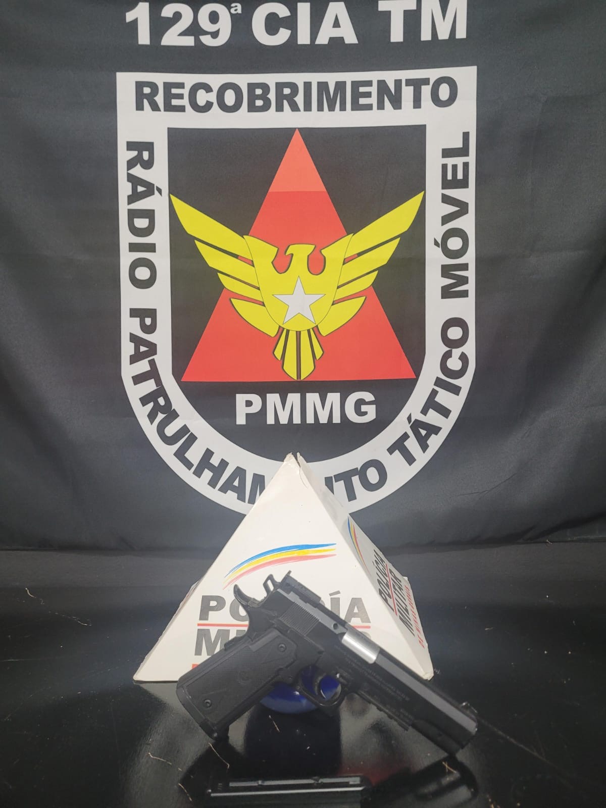 Após os primeiros levantamentos, as equipes policiais iniciaram diligências em locais onde o suspeito poderia estar. O homem foi localizado em uma conveniência na Avenida Santo Antônio. Durante a abordagem, foi encontrada em sua cintura uma arma de airsoft calibre 6 mm, apontada como a utilizada no fato.