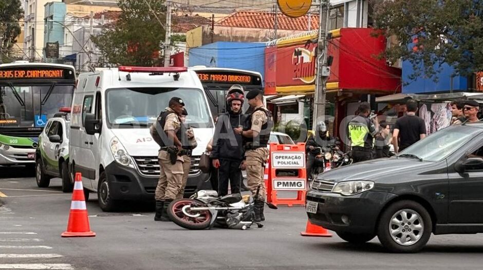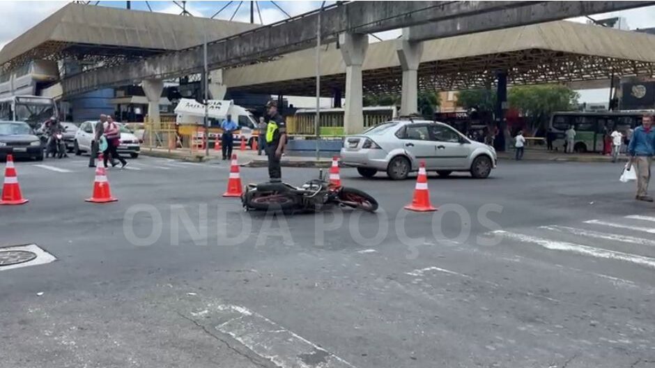 Uma mulher ficou ferida após ser atropelada por uma motocicleta no cruzamento da Rua Assis Figueiredo com a Avenida Francisco Salles, no Centro de Poços de Caldas, na manhã desta terça-feira (18).