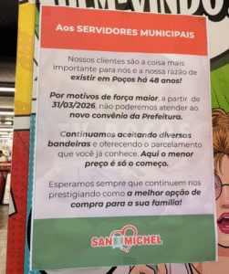 Um cartaz afixado nas unidades da rede informa que “por motivos de força maior”, a partir de 31 de março, não será possível atender ao novo convênio firmado pela Prefeitura. No aviso, direcionado aos servidores municipais, a empresa destaca que continuará aceitando diversas bandeiras e oferecendo opções de parcelamento.