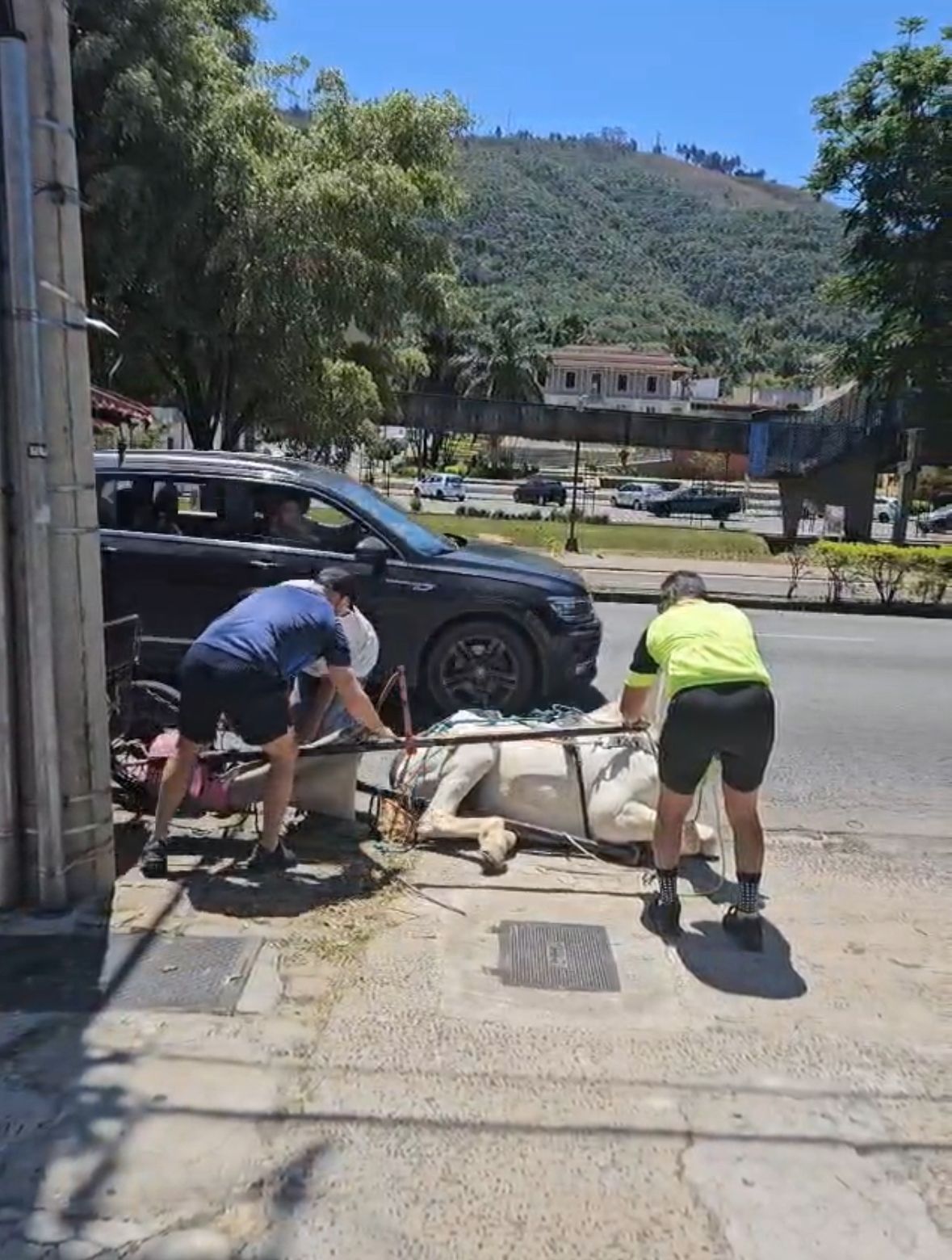 Um vídeo mostrando um cavalo de charrete caído na calçada da Avenida João Pinheiro, em Poços de Caldas, circulou nas redes sociais neste domingo (5). Nas imagens, é possível ver o animal sendo ajudado por algumas pessoas a se levantar.