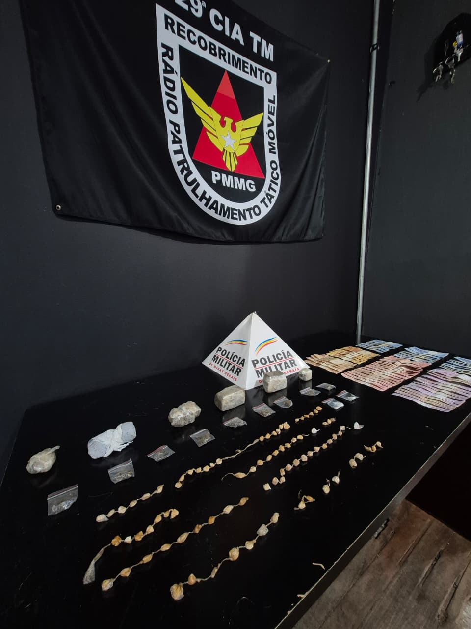 Ao todo, foram apreendidas 83 pedras de substância análoga ao crack, nove buchas e seis tabletes de substância análoga à maconha, dois papelotes de substância análoga à cocaína, além de R$ 587 em dinheiro. Segundo a Polícia Militar, todo o material estava fracionado e embalado, pronto para a comercialização.