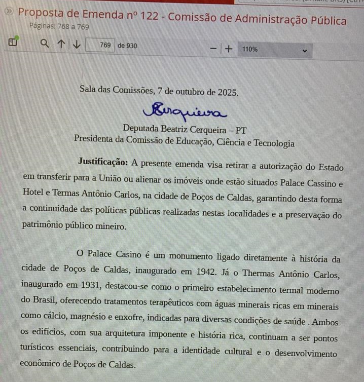 O Projeto de Lei 3.337/2025, de autoria do governador Romeu Zema (NOVO), que autoriza o Governo de Minas a transferir para a União os bens imóveis de propriedade do Estado, como forma de pagamentos da dívida, pode transferir pontos turísticos e emblemáticos de Poços de Caldas: as Thermas Antonio Carlos e o Palace Casino e Hotel.