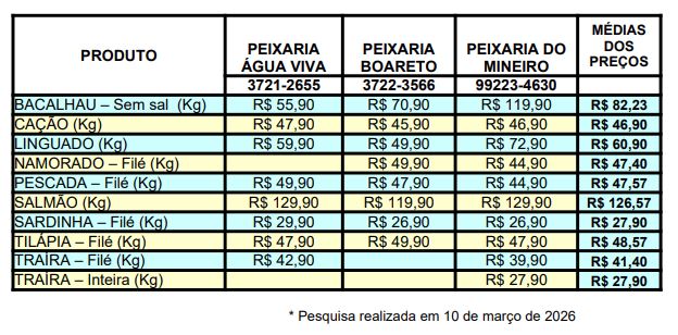 A pesquisa foi realizada de forma presencial, para pagamento em dinheiro/débito, e inclui salmão, bacalhau, pescada, sardinha, tilápia, cação, linguado, traíra e namorado.