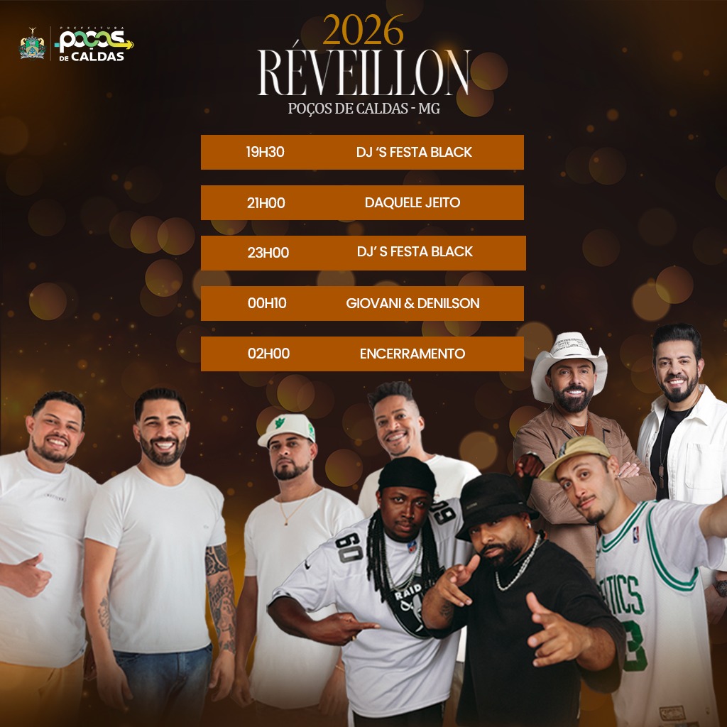 A programação musical promete animar moradores e turistas desde cedo, oferecendo uma variedade de ritmos e atrações para todos os gostos. As festividades começam às 19h30 com DJ – Festa Black, seguidas pelo show do grupo Daquele Jeito às 21h00. Às 23h00, o DJ retorna ao palco para embalar o público até a chegada do novo ano. Logo após a virada, às 00h10, a dupla Giovani & Denilson dá continuidade à celebração, que segue até o encerramento às 02h00.