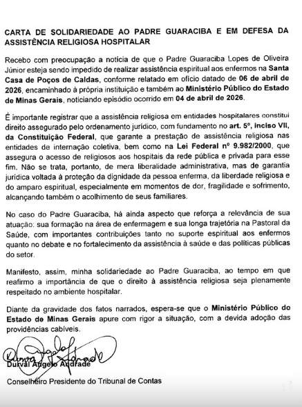 O conselheiro-presidente do Tribunal de Contas de Minas Gerais (TCEMG), Durval Ângelo Andrade, enviou uma carta ao Ministério Público e à Santa Casa de Poços de Caldas solicitando a apuração de uma denúncia de impedimento de assistência religiosa a um paciente dentro da unidade hospitalar.