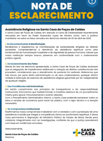 A Santa Casa também se colocou à disposição do Ministério Público de Minas Gerais para colaborar com as investigações. Na nota, o hospital ressaltou que reconhece a importância da assistência espiritual como parte da humanização do atendimento e da dignidade da pessoa.
