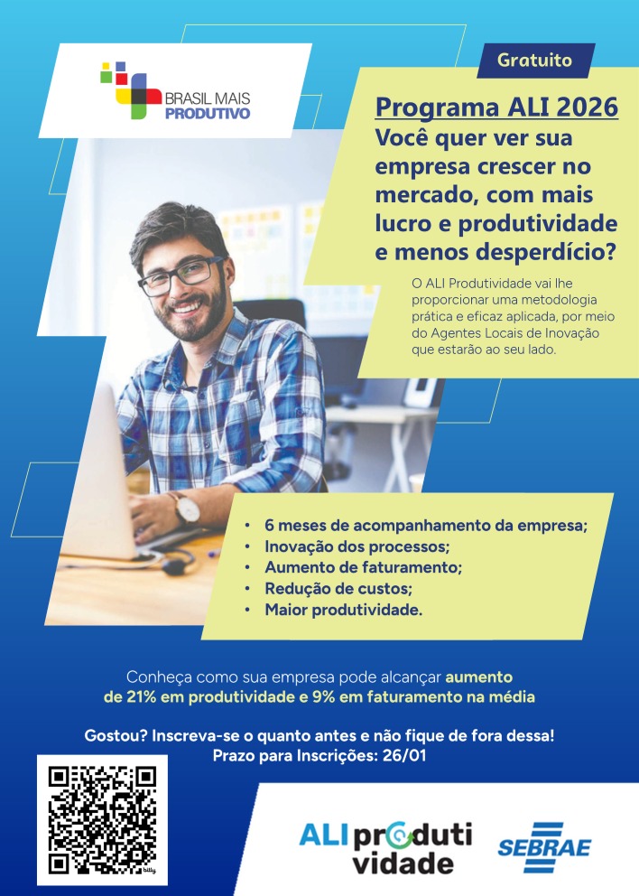 As inscrições para o Programa ALI Produtividade podem ser realizadas por meio de formulário online. Empresários interessados também podem utilizar o QR Code disponibilizado no material de divulgação.