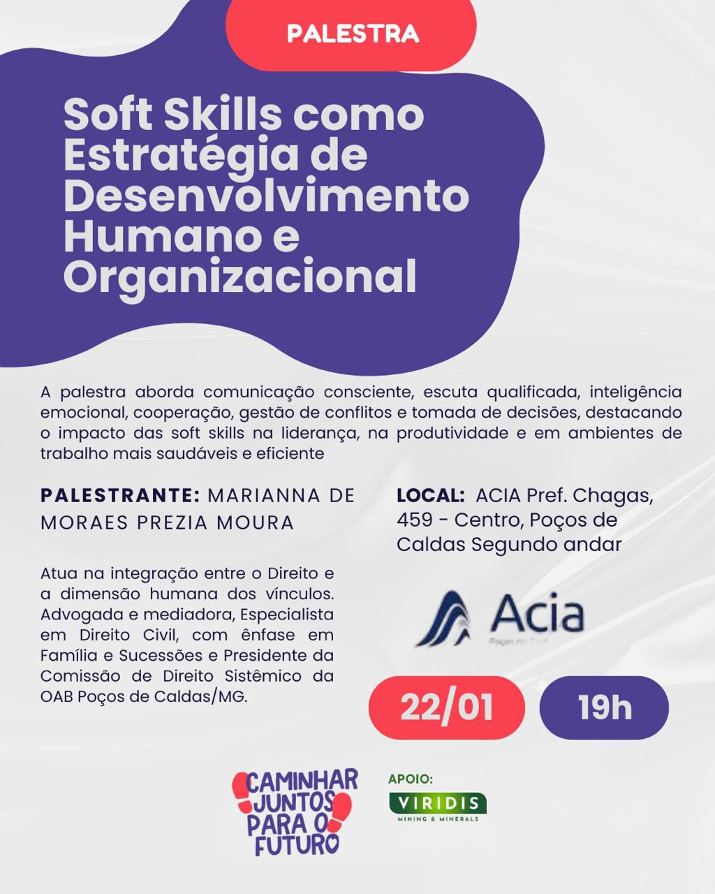 O Projeto Caminhar Juntos – Qualificação e Trabalho para o Futuro realiza, no dia 22 de janeiro (quarta-feira), às 19h, a palestra “Soft Skills como Estratégia de Desenvolvimento Humano e Organizacional”, aberta à população e, especialmente, a empresários, gestores, profissionais e pessoas interessadas em aprimorar relações de trabalho e ambientes organizacionais.