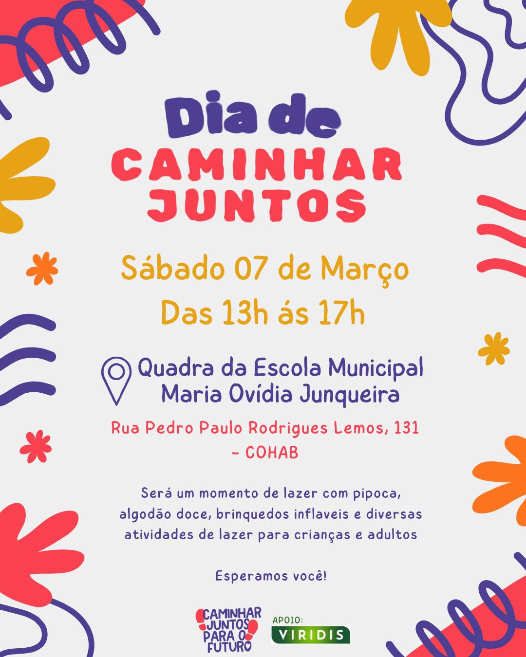 No próximo sábado, dia 07 de março, das 13h às 17h, o Projeto Caminhar Juntos – Qualificação e Trabalho para o Futuro promove o Dia de Caminhar Juntos, uma tarde especial de lazer e convivência comunitária na quadra da Escola Municipal Maria Ovídia Junqueira, localizada na Rua Pedro Paulo Rodrigues Lemos, 131, no bairro COHAB.