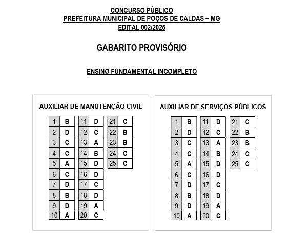 A Prefeitura de Poços de Caldas divulgou no Diário Oficial do Município da noite desta segunda-feira (10) o gabarito provisório das provas do Concurso Público 002/2025.