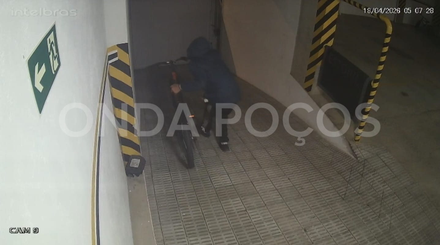 Nas imagens é possível ver o criminoso pulando para dentro do condomínio. Depois disso, ele pega uma bicicleta, vira a câmera de segurança para tentar não ser flagrado nas imagens e pula para fora levando o veículo.