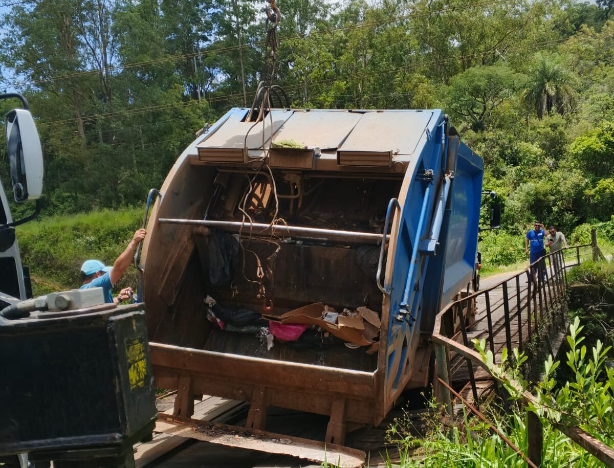 Um caminhão da coleta de lixo da empresa Liarth afundou em uma ponte que dá acesso à Fazenda do Osório, na zona rural de Poços de Caldas, na manhã desta segunda-feira (5). O incidente ocorreu após a estrutura ceder durante a passagem do veículo.